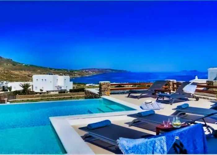 Ao se alojar na Luxurious Mykonian Blue Oasis Villa With Private Pool, os hóspedes podem utilizar as comodidades de autoatendimento disponíveis, incluindo refrigerador e forno. Servindo pratos da cozinha Mediterrane, Solymar está localizado a 20 minutos de distância a pé. O aeroporto mais próximo é de Miconos, localizado a 15 km desta casa de férias.
